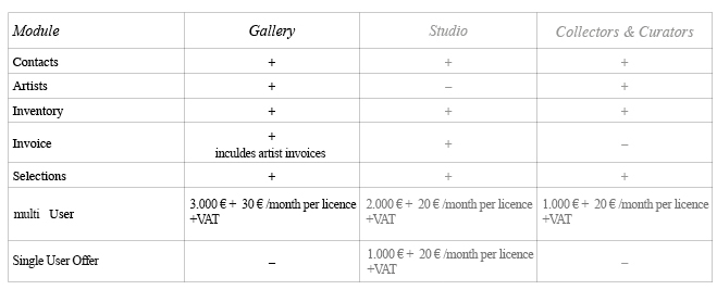 The basic version of art-file Gallery costs 3.000 € plus 19% VAT, each licence costs 30 € per month, this includes telefon support within reasonable limits and updates of art-file.